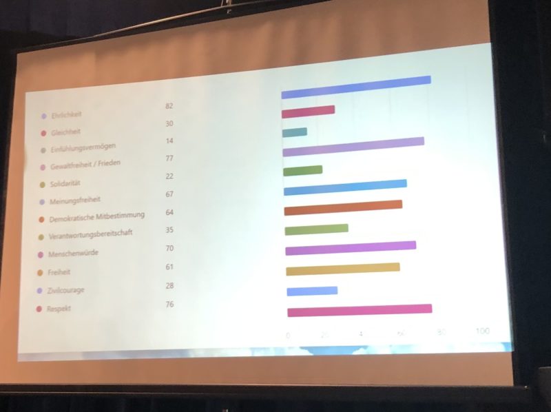 Nach der Begrüßung durch Kreis- und Bezirksvorsitzenden Walter Göbl und dem Grußwort von Landesvorsitzendem Thorsten Frank wies Moderatorin Bettina Harnischmacher auf die Ergebnisse des Mentimeters hin, die aus einer Befragung von Besucherinnen und Besuchern des Mühldorfer Bauernmarktes und der Forumsgäste vor Beginn der Veranstaltung resultierten. Dabei lagen Ehrlichkeit, Respekt und Gewaltfreiheit am besten im Rennen.